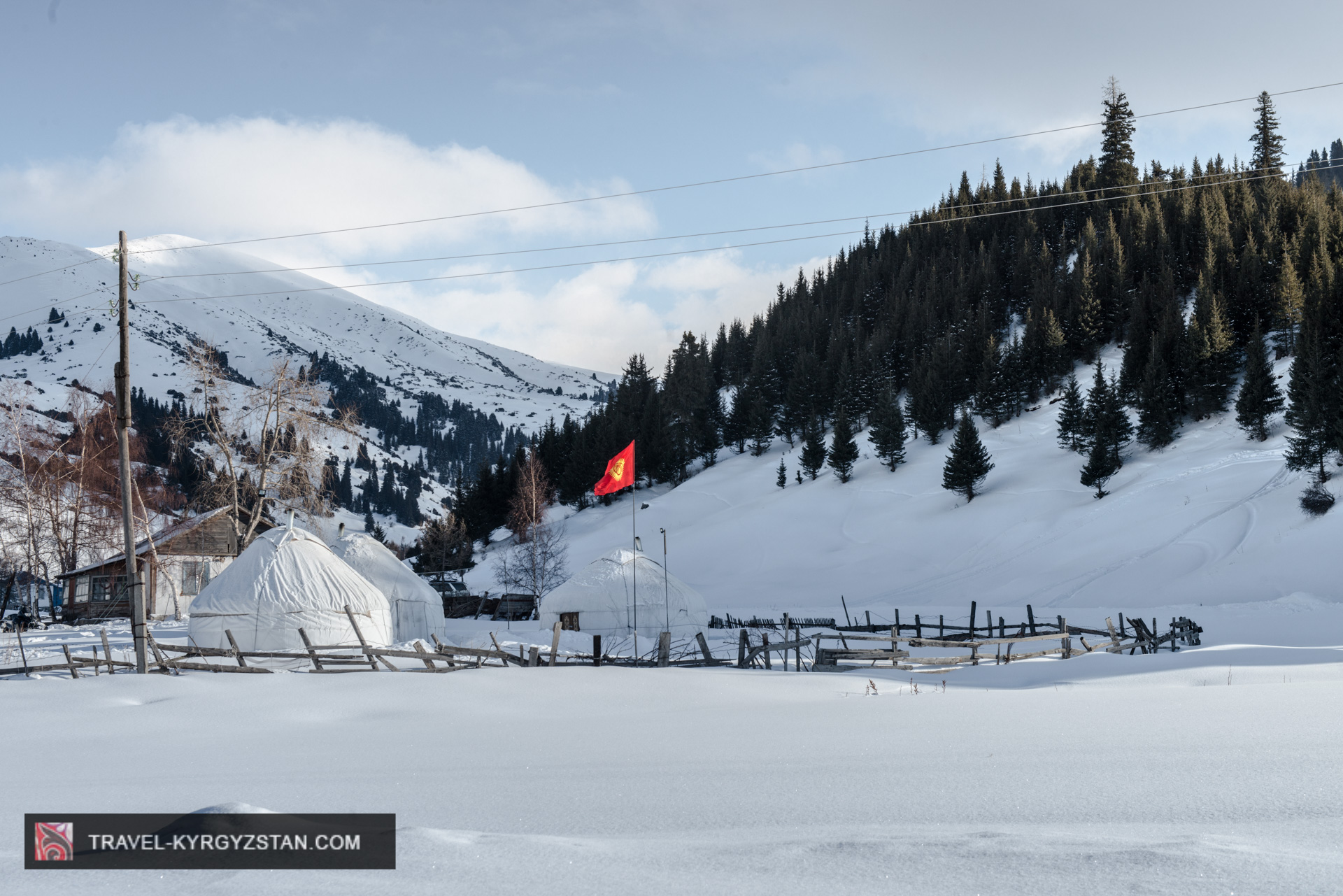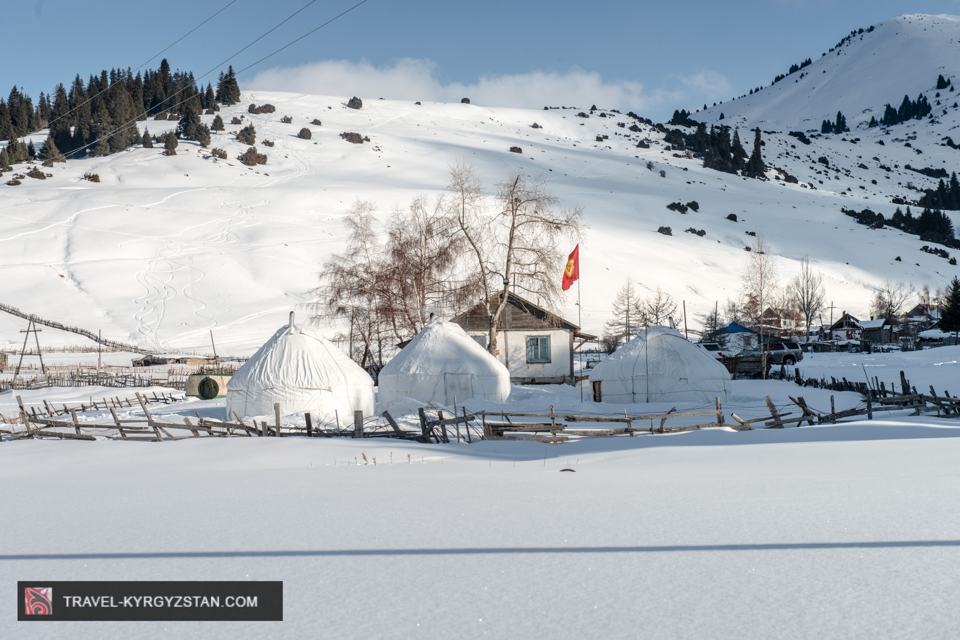 It is around 60km from Karakol village to the East. When entering the Jyrgalan village you will come to a road cross with a few signs (see image below) – you should turn left and follow around 200 meters.